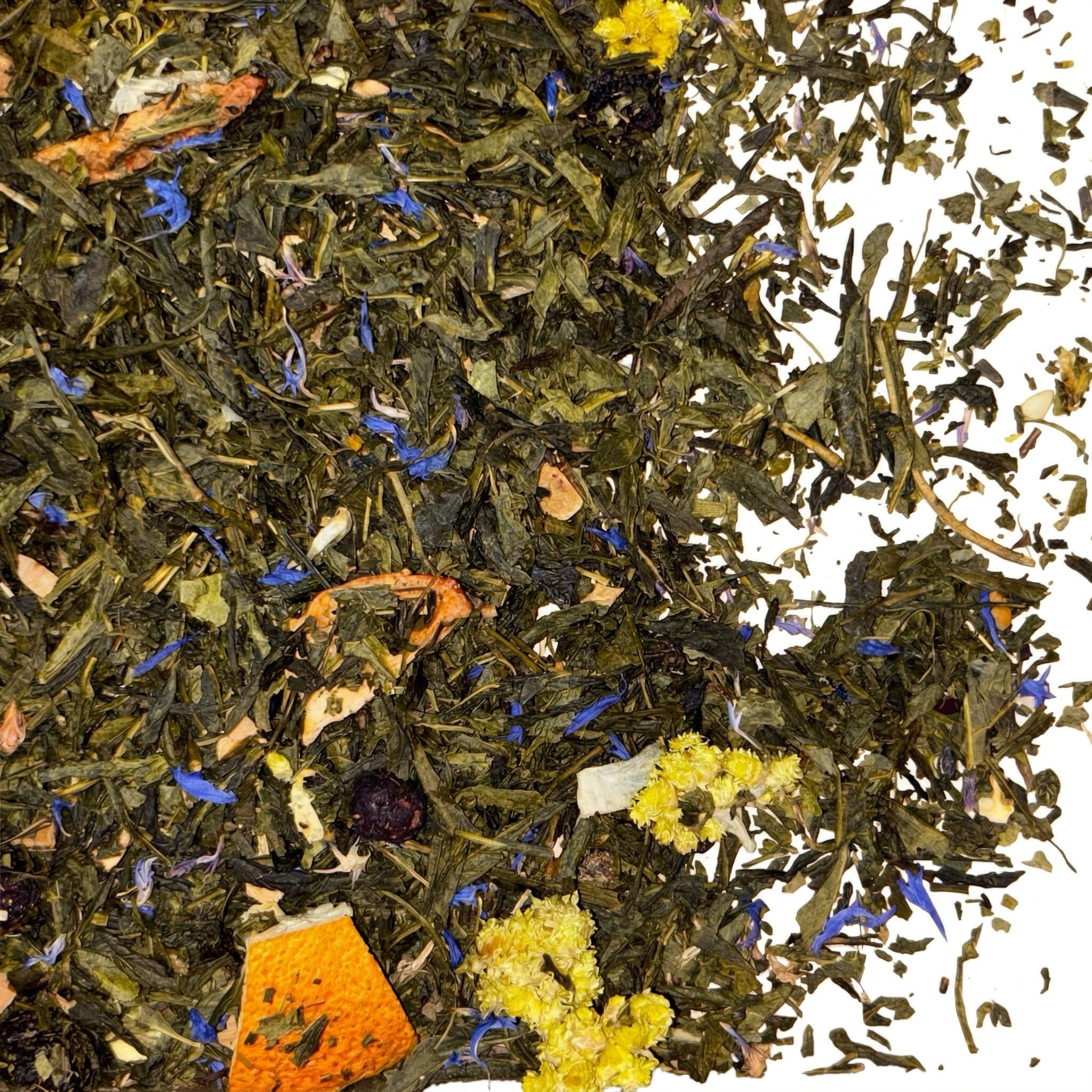 Skład: Zielona herbata liściasta, liofilizowane owoce: borówka, truskawka, pomarańcza, pigwa, kwiat: bławatka, kocanki, aromat.